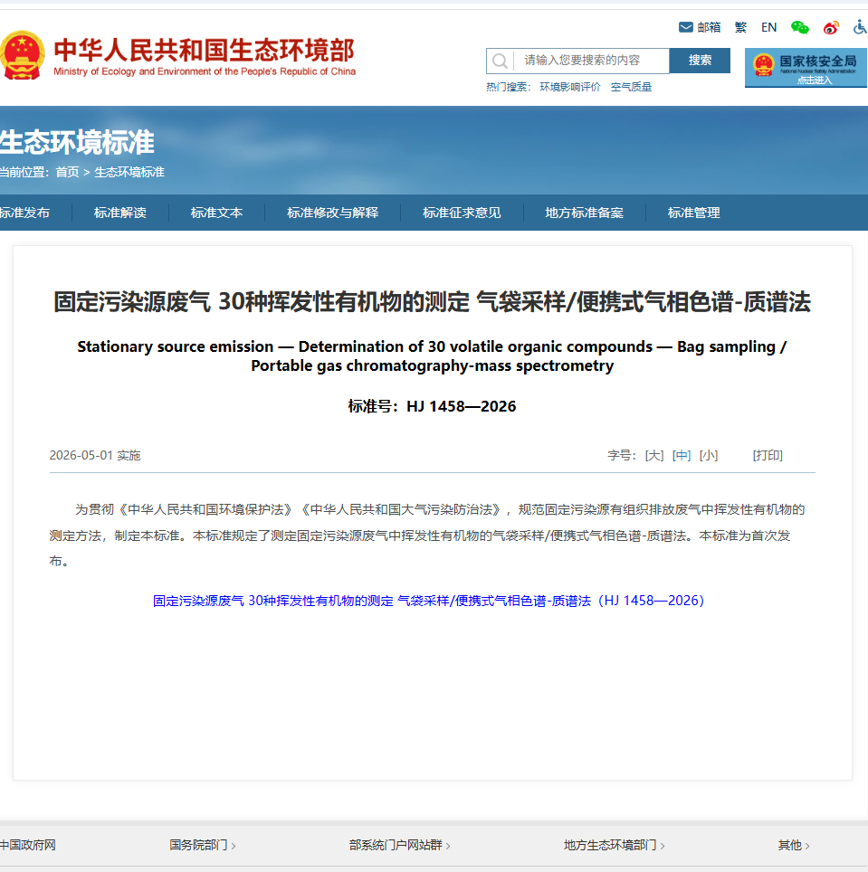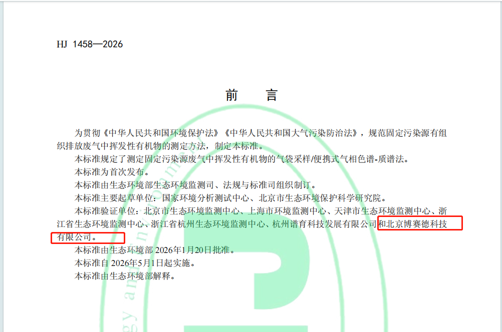 2026年5月1日HJ 1458-2026《固定污染源废气 30种挥发性有机物的测定 气袋采样/便携式气相色谱-质谱法》正式实施,作为该标准官方验证单位,北京博赛德科技有限公司深度参与标准研究与验证全流程,依托二十多年VOCs检测技术积淀,打造覆盖「采样-配气-分析-服务」的固定污染源废气现场检测整体解决方案,精准匹配新标准要求,为环境监测、环保执法、企业自检等提供合规、高效、稳定的检测支撑!